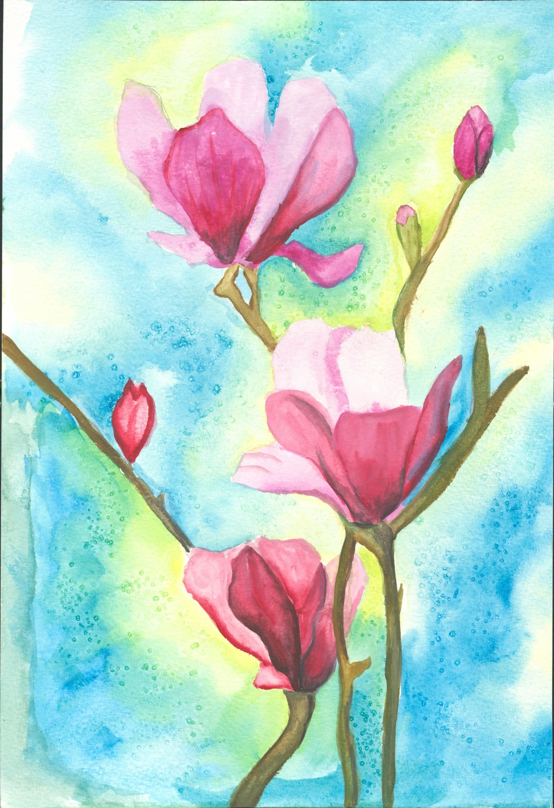 Vibrant pink flowers bloom boldly against a vast landscape. Its delicate petals, rendered in soft washes of color, contrast with the stark, minimalist background. This delicate flower, with its soft-washed petals, becomes a living poem about finding beauty in adversity.